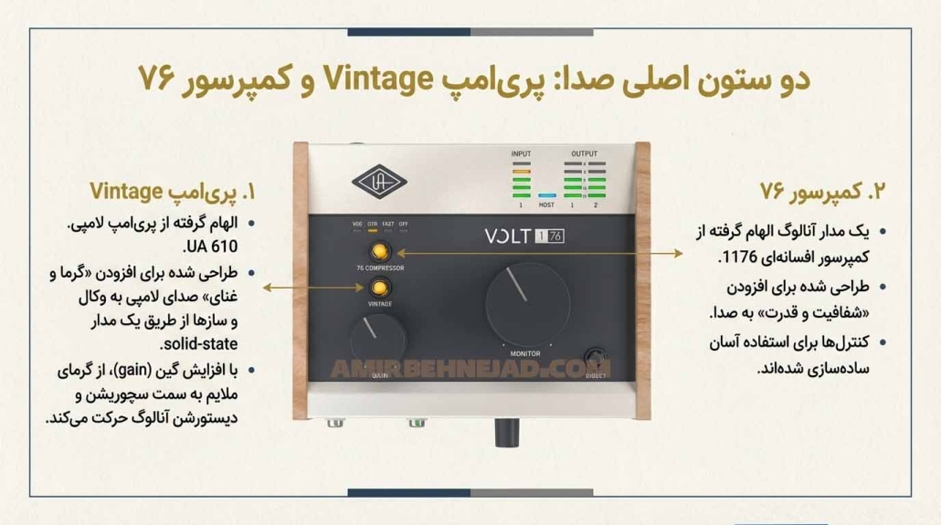 - اما اگر هدف نهایی شما این است که صدای وکال شما از همان لحظه ضبط، دارای کاراکتر، گرما (Vintage 610) و کنترل داینامیک حرفهای (آنالوگ ۷۶) باشد و فقط به یک ورودی با بالاترین کیفیت نیاز دارید، Volt 176 بدون رقیب است. این کارت صدا به شما اجازه میدهد که صدای “آلبوم-آماده” را مستقیماً به نرمافزار خود پرینت بگیرید، کاری که در این رده قیمت توسط هیچ کارت صدای دیگری انجام نمیشود.